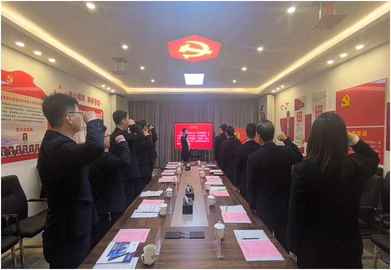 公司黨支部副書記、工會(huì)主席張波興帶領(lǐng)兩個(gè)支部全體黨員重溫入黨誓詞。