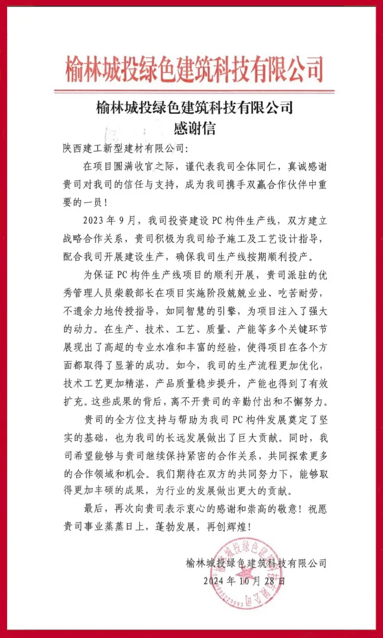 柴毅有多崗位工作經(jīng)歷,派駐過程中為合作伙伴在生產(chǎn)流程、技術(shù)工藝、產(chǎn)品質(zhì)量和產(chǎn)能提升等方面不遺余力地傳授指導(dǎo)。他的辛勤付出和不懈努力,不僅贏得了合作伙伴的高度贊譽(yù),更為我司贏得了良好的業(yè)界口碑。為此,榆林城投綠色建筑科技有限公司特向我司發(fā)來感謝信,并贈(zèng)送寫有“精誠合作,攻堅(jiān)克難”的錦旗,以表達(dá)對我司及柴毅的深深謝意。