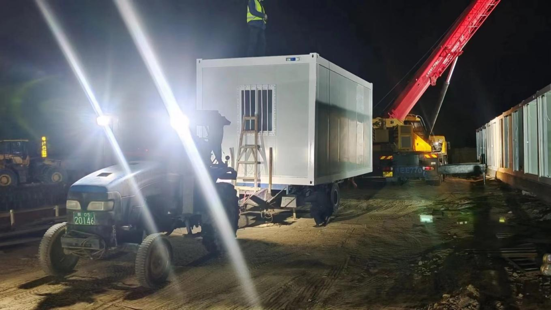 開工初期,全國范圍內(nèi)的疫情肆虐嚴(yán)重影響了建筑材料的運(yùn)輸,各地中高風(fēng)險(xiǎn)區(qū)大量方艙醫(yī)院需求又造成了整個(gè)箱房行業(yè)的嚴(yán)重缺貨,對我司的備貨供貨能力提出了嚴(yán)峻考驗(yàn),按照潼關(guān)縣防疫政策要求,自4月8日起外地車輛和人員實(shí)行勸返政策,打包箱,門窗等重要原材料以及負(fù)責(zé)管道、電纜的施工隊(duì)伍都沒能按時(shí)進(jìn)入施工現(xiàn)場......面對困難,不等不靠,主動出擊,是陜建人的鐵血作風(fēng),在雙重壓力下,項(xiàng)目負(fù)責(zé)人連夜召集相關(guān)人員召開緊急會議集中破解難題,會議部署:一是尋求潼關(guān)縣政府相關(guān)部門協(xié)助建設(shè)物資運(yùn)輸,在不違反防疫原則,嚴(yán)格做好疫情防控的前提下,實(shí)行特事特辦,專事專辦,公司提前報(bào)備運(yùn)輸行程,制定專門的運(yùn)輸路線進(jìn)行點(diǎn)對點(diǎn)運(yùn)輸,定時(shí)定點(diǎn)消殺,嚴(yán)防因項(xiàng)目施工導(dǎo)致的疫情傳播;二是千方百計(jì)調(diào)配原材料,公司廠內(nèi)現(xiàn)有庫存原料全部用于支持潼關(guān)項(xiàng)目,剩余缺口全公司調(diào)用一切資源協(xié)調(diào),必須保障項(xiàng)目順利實(shí)施。定了就干,說了就辦,會議精神迅速落實(shí),每個(gè)環(huán)節(jié)、每項(xiàng)任務(wù)全部精確歸責(zé)落實(shí)到人,隨著各項(xiàng)任務(wù)不斷執(zhí)行到位,項(xiàng)目建設(shè)開啟了“加速鍵”, 4月9日早上6點(diǎn),打包箱材料運(yùn)到了現(xiàn)場,早上7點(diǎn),專業(yè)的施工隊(duì)伍到達(dá)現(xiàn)場,當(dāng)日,第一批材料也及時(shí)到達(dá)現(xiàn)場,同時(shí)抵達(dá)的還有從行業(yè)內(nèi)調(diào)配的整套箱房材料,4月10日凌晨,施工現(xiàn)場燈火通明,塔吊林立,機(jī)器轟鳴,箱式房吊裝作業(yè)正式啟動,四月的深夜依然寒意凜凜,但每個(gè)參建者卻汗流浹背,斗志昂揚(yáng)......